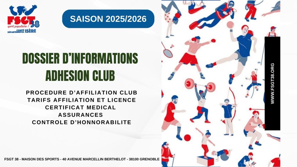 Dès le 20 août 2025, vous pourrez vous affilier avec la même procédure que l’an dernier, après validation par le comité de la catégorie du club et de son activité principale. Retrouvez toutes les informations sur le site de la fédération (www.fsgt.org) ou contactez nous(fsgt38@wanadoo.fr)